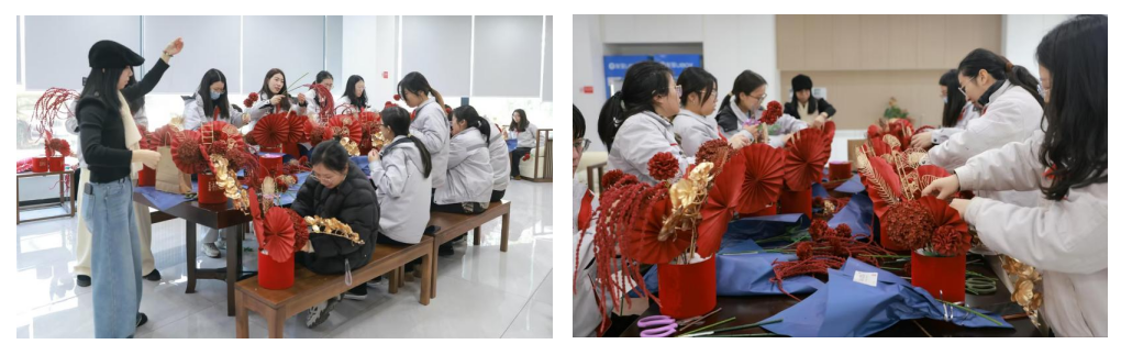 活動伊始,老師首先為大家仔細闡述了年宵花的文化起源及其材料包,緊接著為大家演示了年宵花的制作步驟。隨后,同志們親手為銀柳點綴上一件件精巧的掛飾,將美好的期盼與祝福細細編織進每一處細節。一盆盆寓意吉祥的年宵花爭相吐艷,掛滿“納福”“如意”等祝福語的銀柳紅飾色澤飽滿、熱烈如火,瞬間點燃了新春的氛圍,寄托了大家對新一年公司高質量發展和即將到來的新春佳節最美好的祝愿。