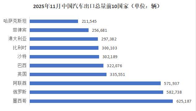 近年來,中國汽車出口規(guī)模與效益實現(xiàn)快速增長。2025年1-12月,我國汽車出口總量達832萬輛,同比增長30%,其中新能源汽車出口343萬輛,同比大幅增長70%,增速顯著高于去年同期水平。整車出口市場呈現(xiàn)多元化格局,墨西哥、俄羅斯、阿聯(lián)酋、巴西、英國等位居前列,阿聯(lián)酋、墨西哥、澳大利亞、阿爾及利亞、英國等市場增量尤為顯著。