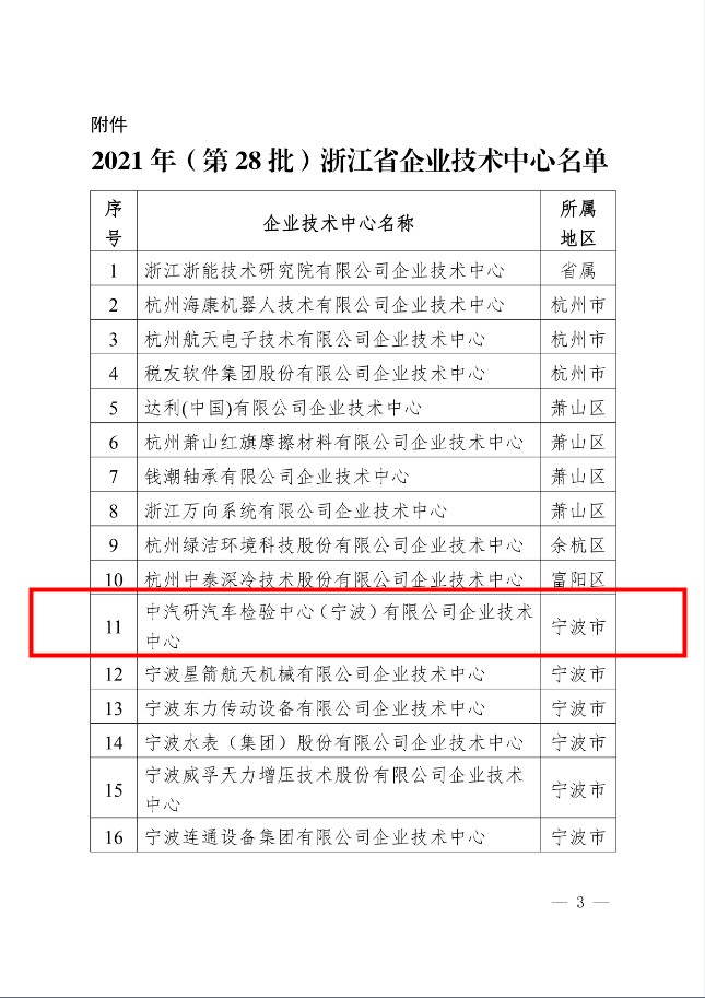 喜訊:中汽研汽車檢驗中心(寧波)有限公司企業技術中心被認定為浙江省企業技術中心