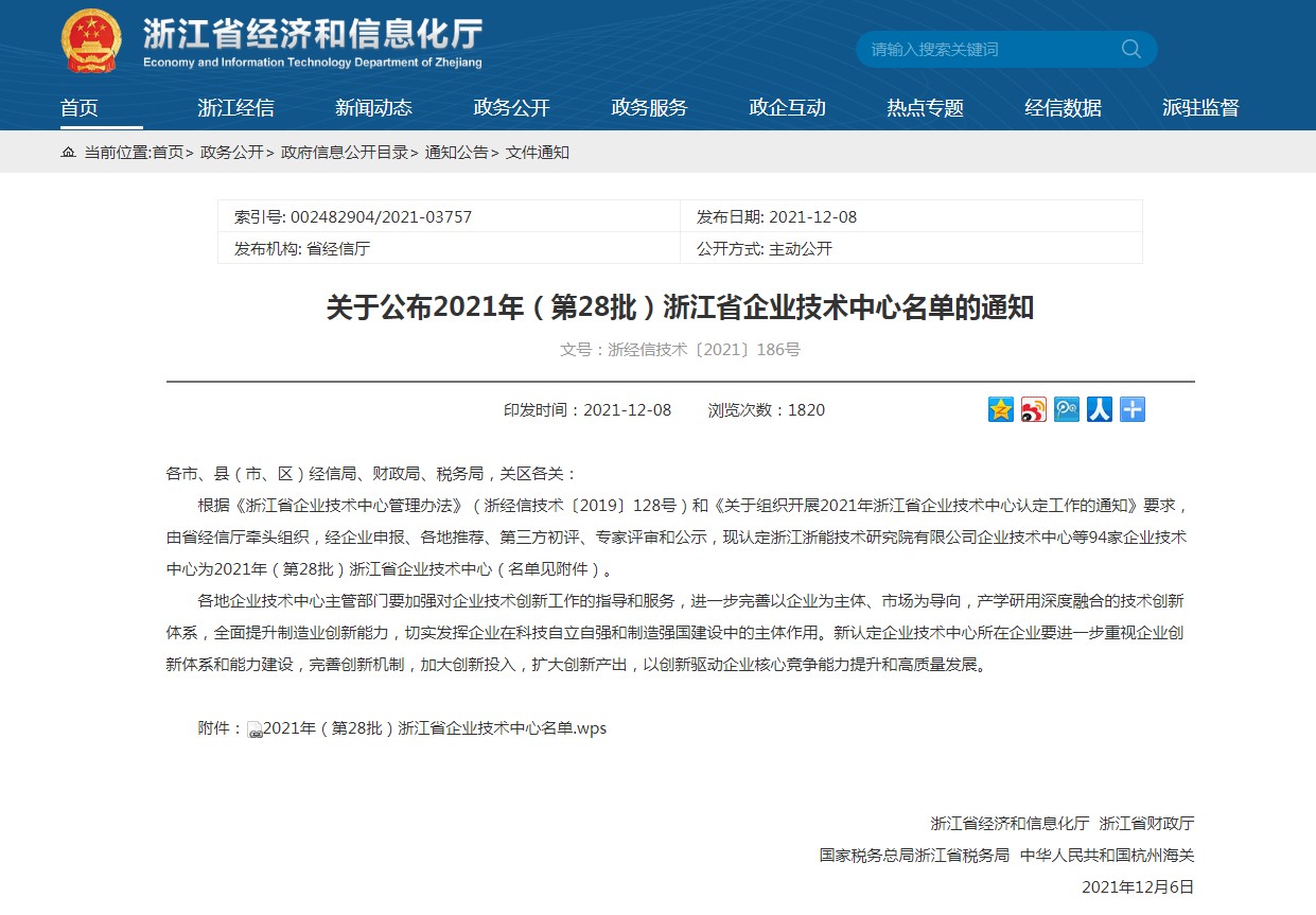 12月10日,浙江省經濟和信息化廳公布了2021年(第28批)省級企業技術中心名單,中汽研汽車檢驗中心(寧波)有限公司企業技術中心被認定為浙江省企業技術中心。