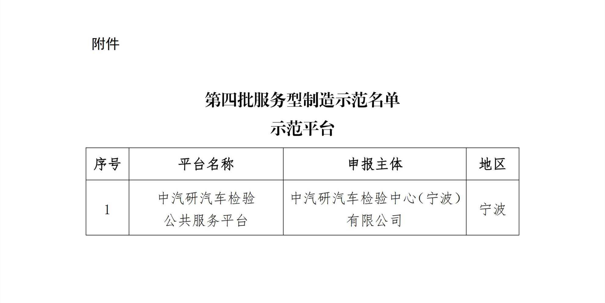 近日,工業和信息化部辦公廳發布《關于公布第四批服務型制造示范名單的通知》。中汽研汽車檢驗中心(寧波)有限公司獲得“國家級服務型制造示范平臺”殊榮!這是寧波檢驗中心繼“國家級中小企業公共服務示范平臺”和“國家知識產權優勢企業”后獲得的又一項國家級榮譽,是寧波檢驗中心創新驅動發展的又一次重大突破!