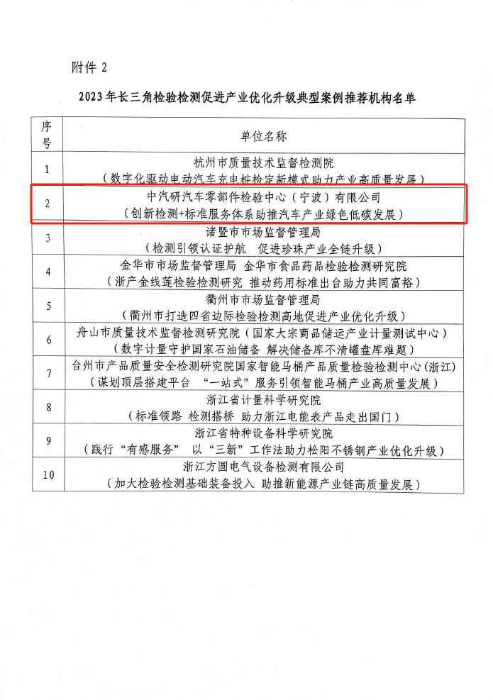 中汽研汽車零部件檢驗中心(寧波)有限公司(以下簡稱“寧波零部件公司”)申報的案例《創新檢測+標準服務體系助推汽車產業綠色低碳發展》,經初步篩選、專家評選等環節,確定入選2023 年長三角檢驗檢測促進產業優化升級典型案例十佳推薦機構名單。