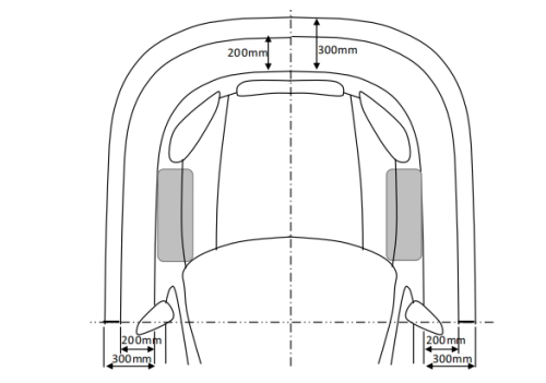 車輛后視鏡中心前方和側方200mm至300mm之間的范圍,具體指: