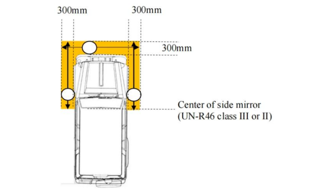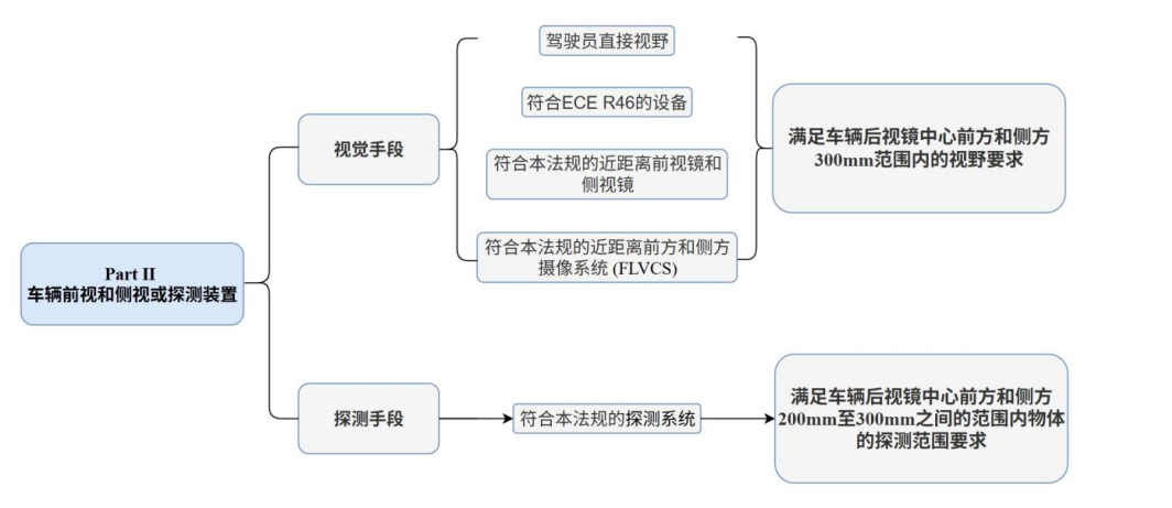 法規PartⅡ部分,要求車輛從靜止狀態啟動前應向駕駛員提供至少一種視覺或探測手段,如符合要求的攝像系統、探測系統等,以滿足車輛后視鏡中心前方和側方300mm范圍內的視野要求,或車輛后視鏡中心前方和側方200mm至300mm之間的范圍內物體的探測范圍要求。