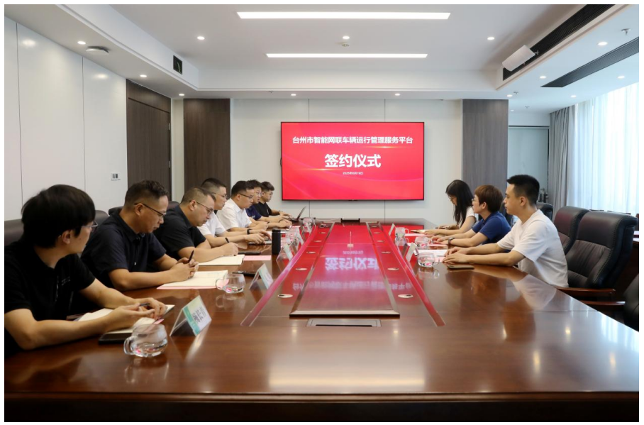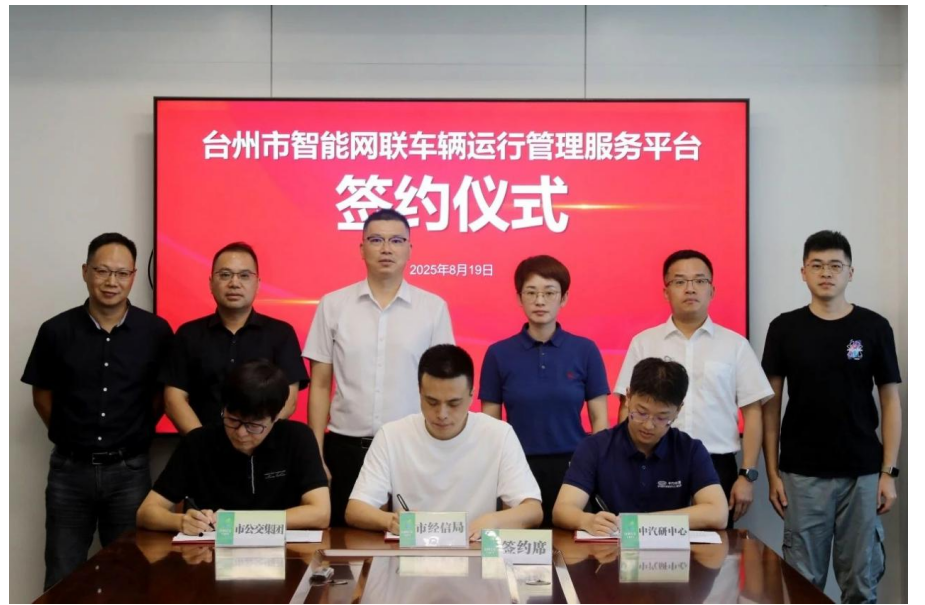 儀式現場,臺州市經信局與寧波檢驗中心、臺州市公交集團正式簽署了《臺州智能網聯車輛道路測試和示范管理第三方機構監管委托協議》。