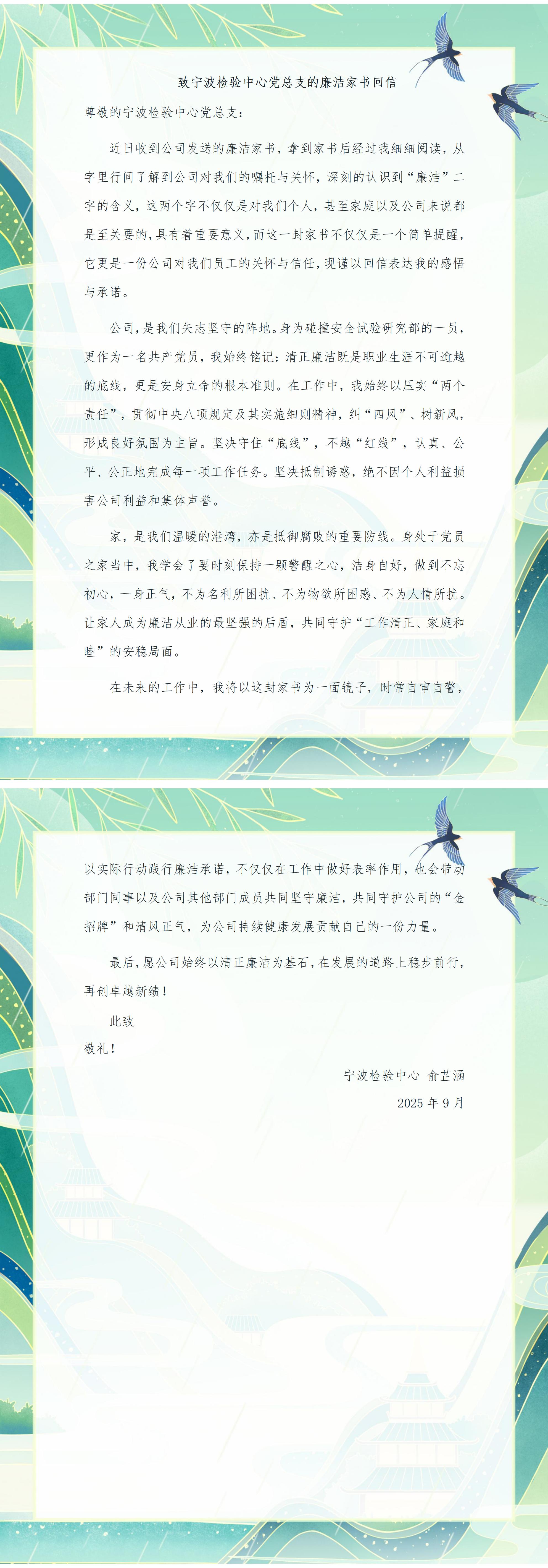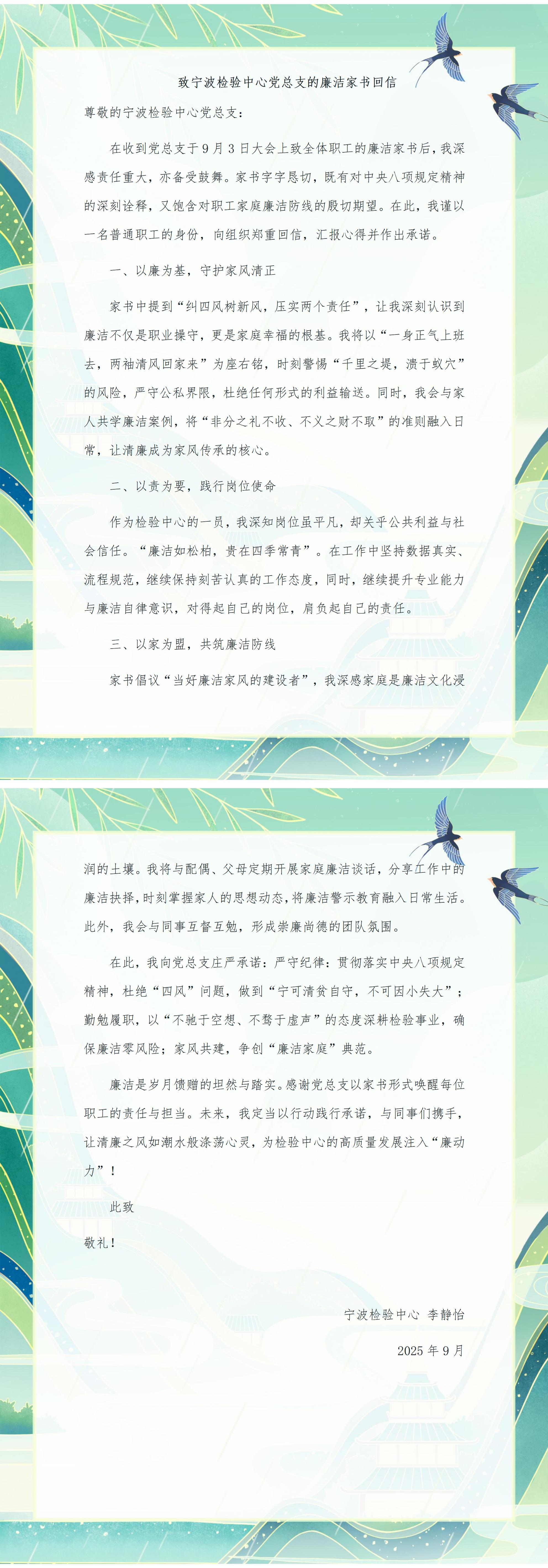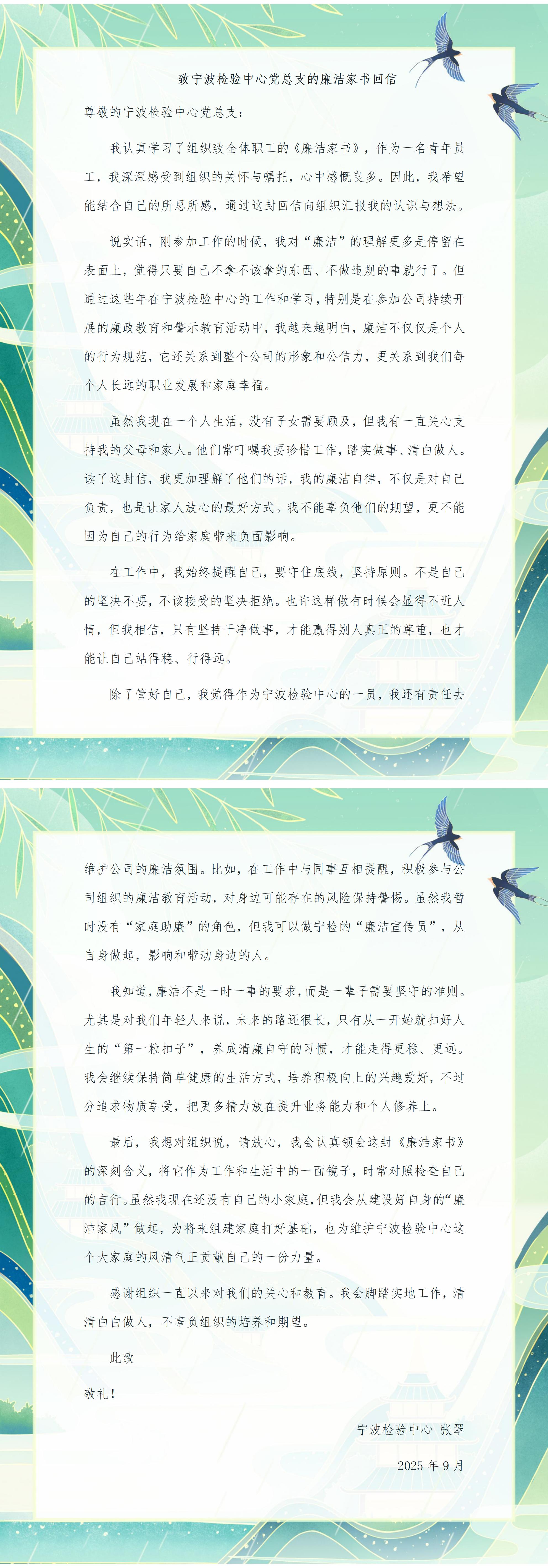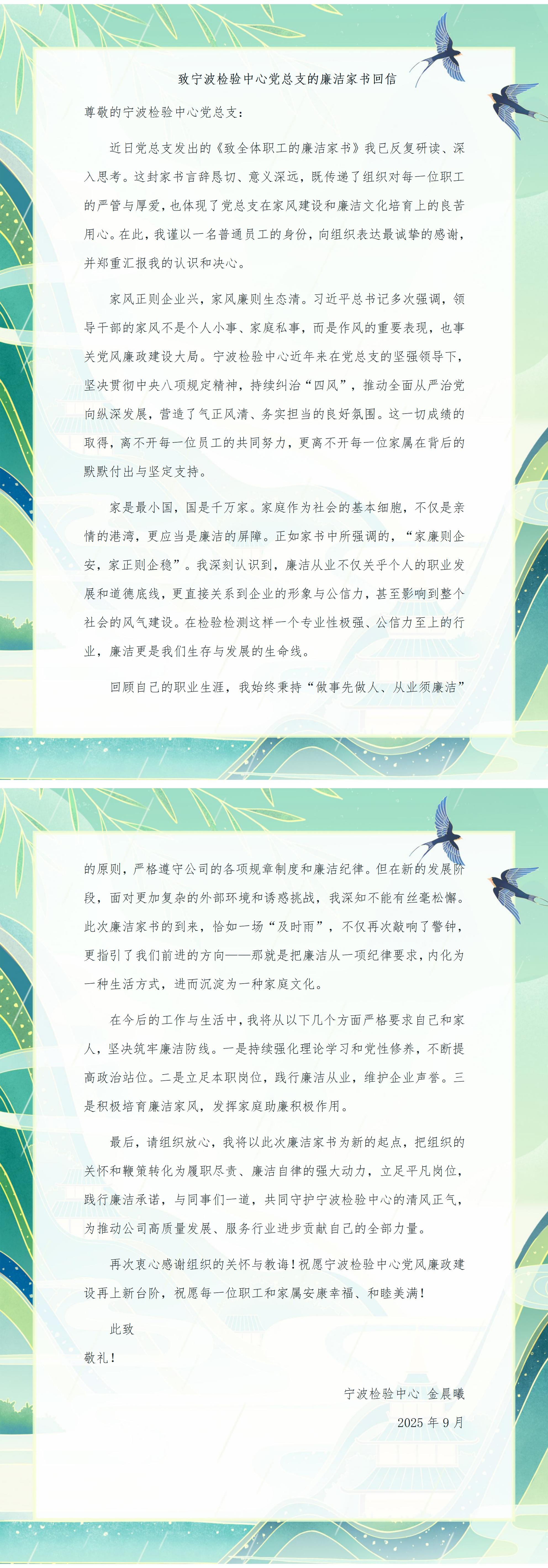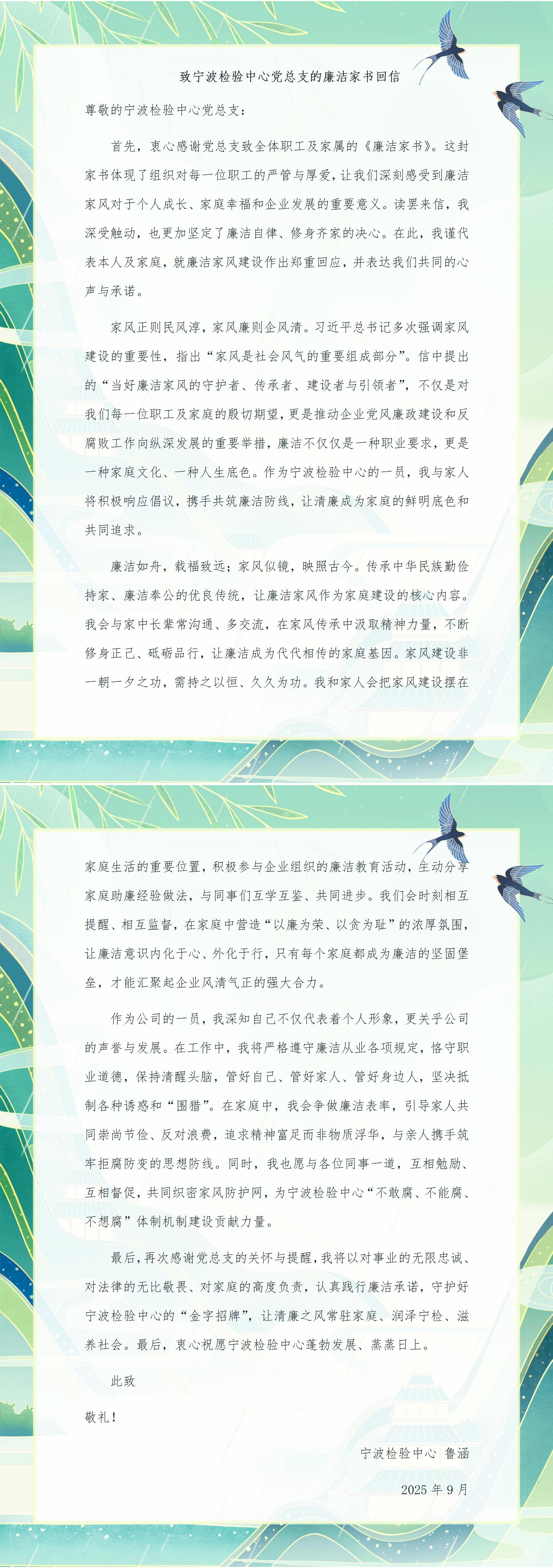 廣大職工結(jié)合實(shí)際工作,積極響應(yīng),回信分享對(duì)廉潔修身、廉潔齊家的深刻感悟,傳遞崇廉尚德的價(jià)值理念,現(xiàn)摘取部分職工對(duì)寧波檢驗(yàn)中心黨總支的回信,與廣大職工及家屬共勉。